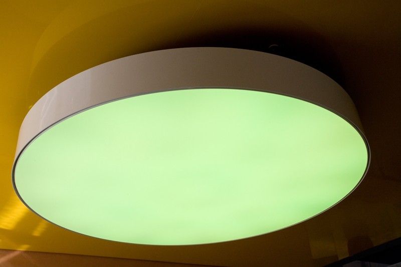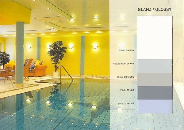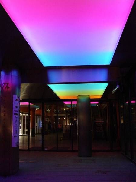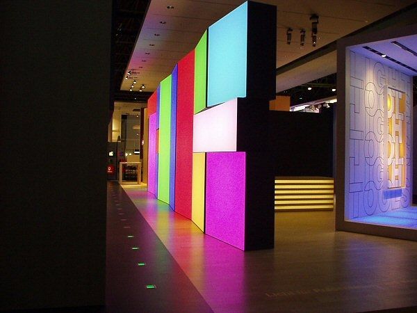 Dadurch sehen Sie dann eine beleuchtete Fläche, nicht aber die einzelne Lichtquelle dahinter. Um Lichtdecken und -wände farbig erscheinen zu lassen, werden die dahinter vierfarbig (rot, grün, blau, weiß) eingebauten Leuchtstoffröhren gemischt. Diese sind programmiert und einzeln ansteuerbar. Daraus ergeben sich faszinierende Farbverläufe; mehr als 1,6 Millionen Farbnuancen sind möglich.