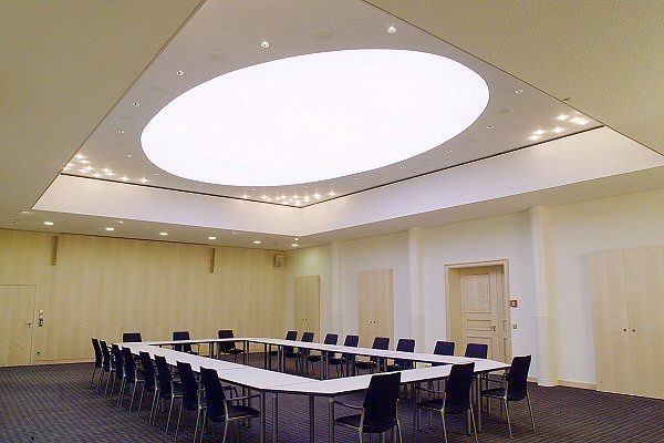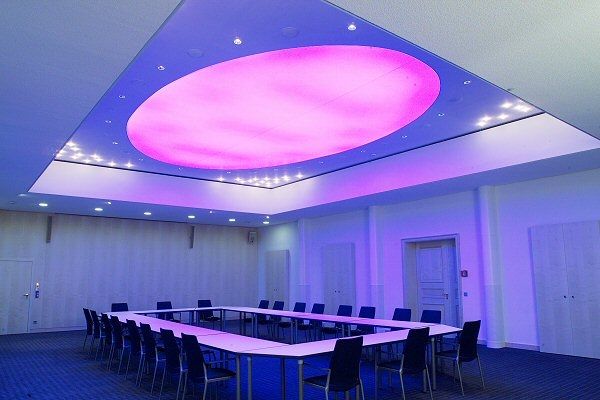 Das Geheimnis der Lichtdecke liegt in der transluzenten Diffusorfolie. Das bedeutet, dass die hier eingesetzte Folie nicht transparent, aber dennoch lichtdurchlässig ist. Spezielle Leuchtmittel (weiß, farbig oder wechselnde Lichtfarben) hinter der Decke sorgen für eine gleichmäßige, flächige Ausleuchtung. So lassen sich beispielsweise ein Sonnenuntergang oder Tageslichtverlauf durch verschiedene Techniken problemlos realisieren. Damit erfüllt die Lichtdecke nicht nur hohe Design-Ansprüche, sondern auch Anforderungen, die an eine arbeitsplatzgerechte Allgemeinbeleuchtung gestellt werden.